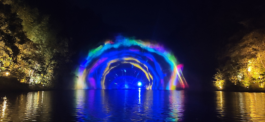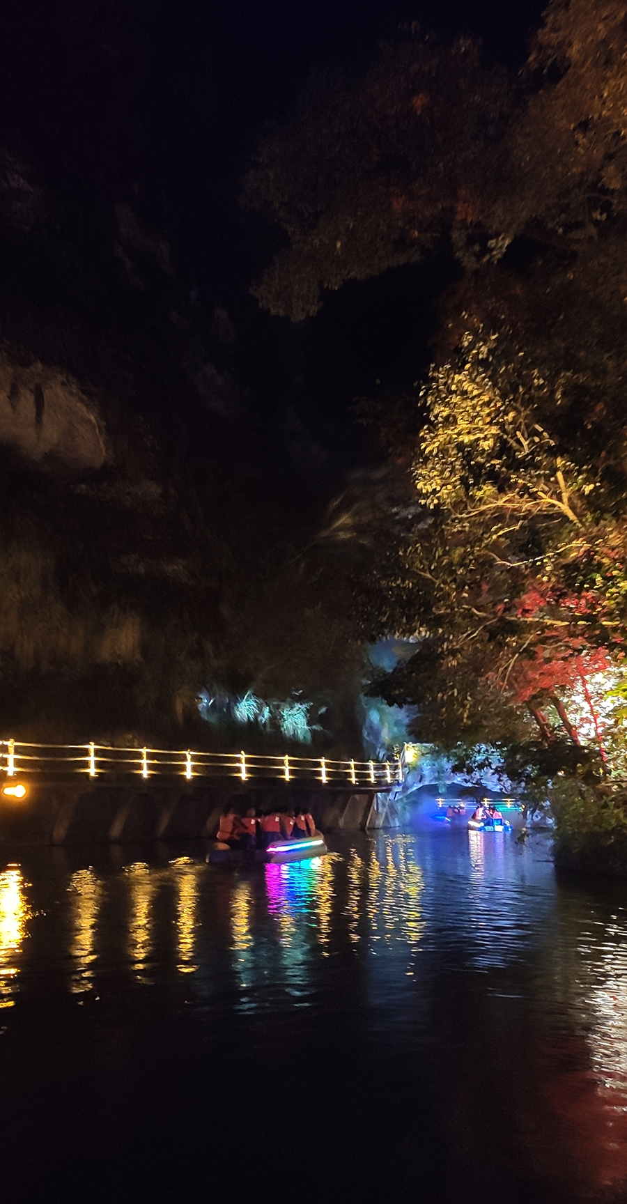 入夜,黨支部一行來到本次文旅最精彩的項目:“夜游九龍?zhí)?rdquo;。以“夜游九龍?zhí)?,靜享夜的美”為主題的“行進式”水上峽谷夜游景區(qū),利用現(xiàn)代化聲光技術與景區(qū)自然美景有機融合,讓您充分感受“詩意山水,光影幻境”。聽蛙唱蟲奏,觀月下仙境,月光映水,水波映月,加上臨水棧道邊笛聲陣陣......讓您真切的領會空靈、幽靜、夢幻的別樣意境。一路的聲光風景讓人目不暇接,如果不是身臨其境,絕對感受不到那光影與大自然結合產(chǎn)生的絕妙意境。