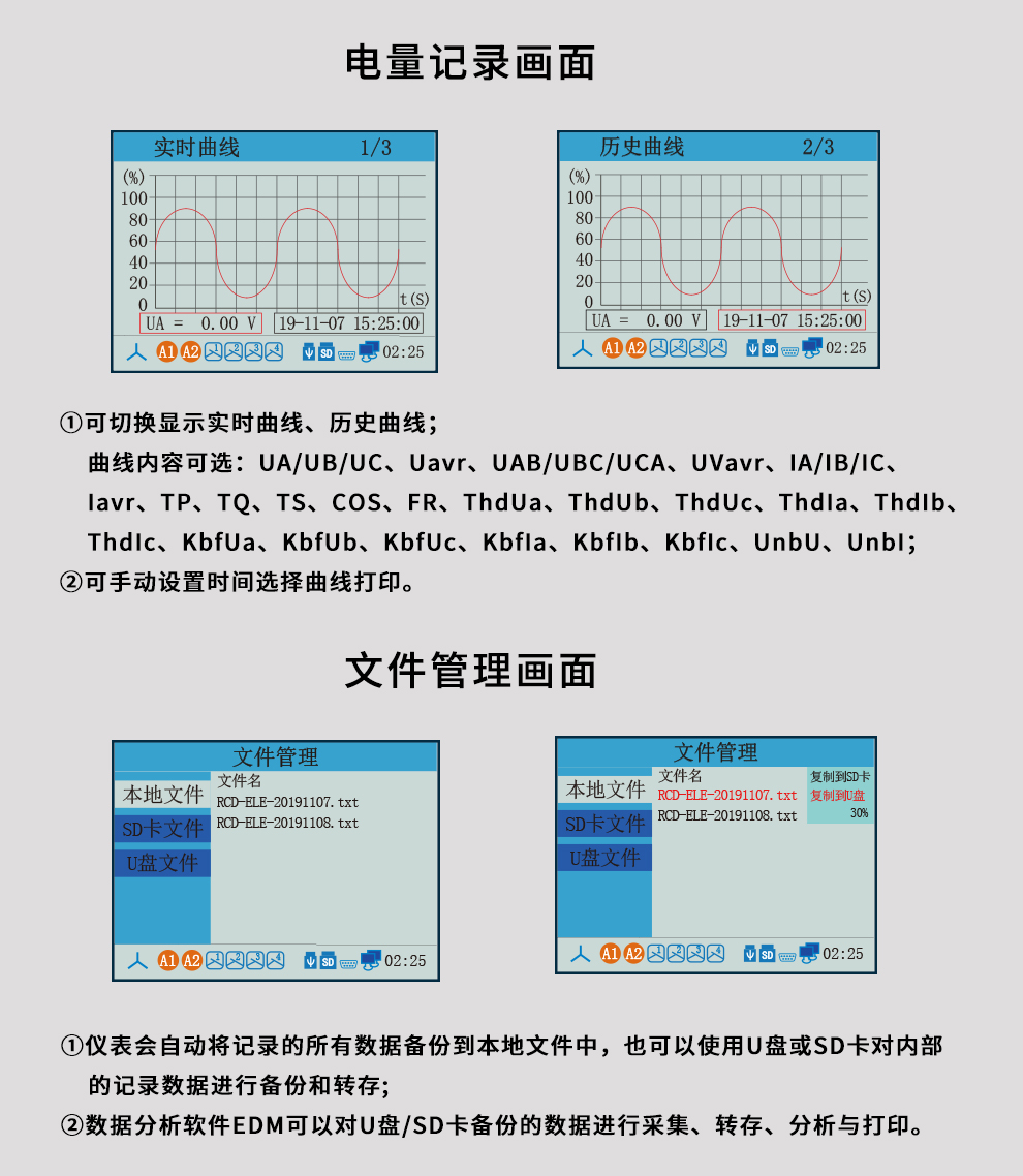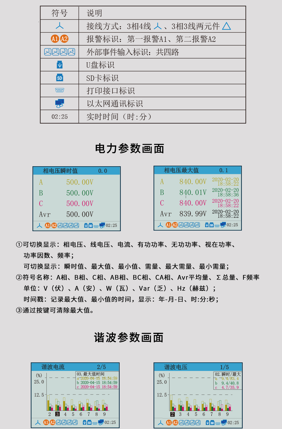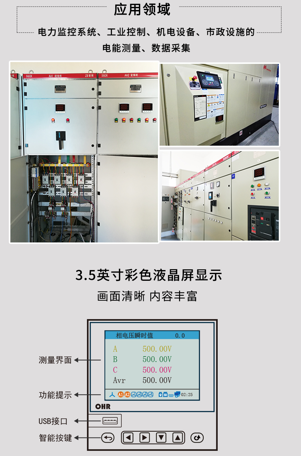 OHR-C900系列電能質量分析記錄儀采用新進的集成電路及數(shù)字采樣技術,對三相電氣線路中的交流電流/電壓、 有功功率、無功功率、視在功率、功率因數(shù)、工頻周波、諧波、有功電能、無功電能、四象限電能、波峰系數(shù) 及不平衡度等進行實時測量顯示與在線分析。