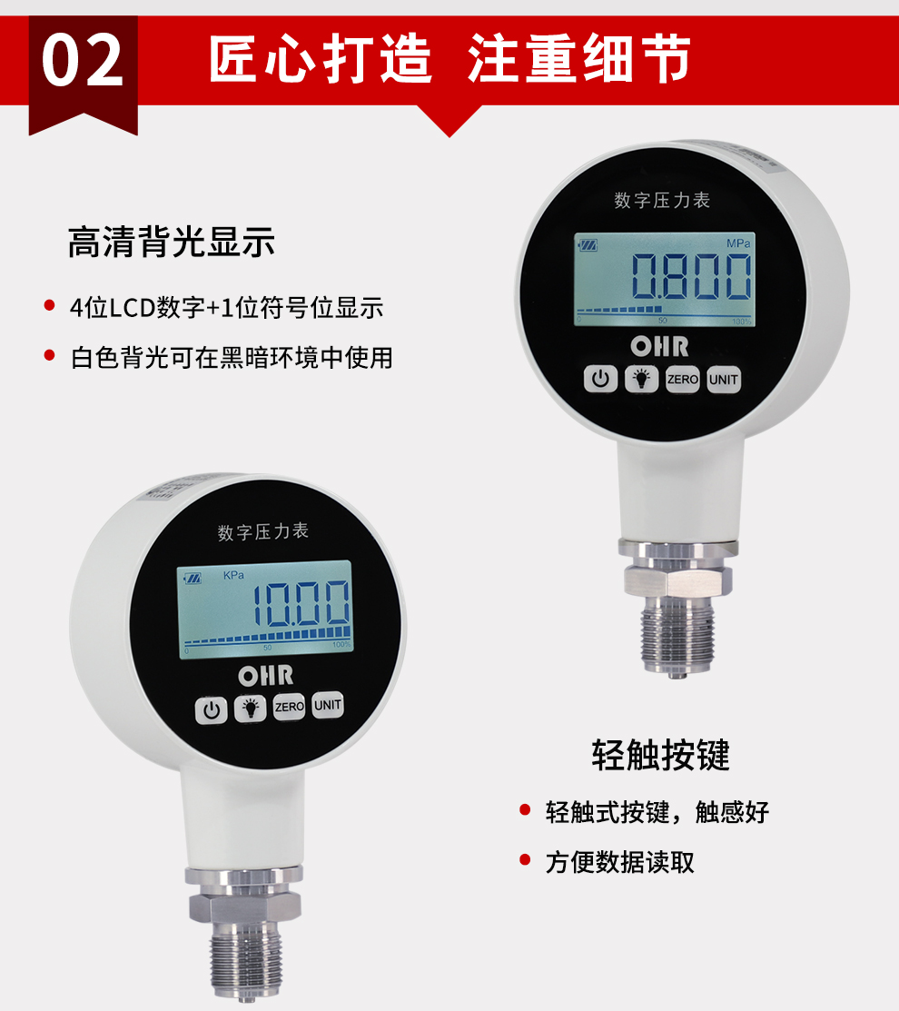 OHR-DP10系列智能數(shù)字壓力表內(nèi)置高精度傳感器,能夠準(zhǔn)確的實(shí)時(shí)顯示壓力,并具有精度高、長(zhǎng)期穩(wěn)定性好的 特點(diǎn)。該產(chǎn)品采用鋁合金殼體和不銹鋼接頭,抗震性好,能夠測(cè)量氣體、液體、油等介質(zhì);具有一鍵清零、峰值 谷值記錄、量程百分比棒圖顯示、單位切換等功能;適用于便攜式壓力測(cè)量、設(shè)備配套、 校驗(yàn)設(shè)備等壓力測(cè)量領(lǐng)域。