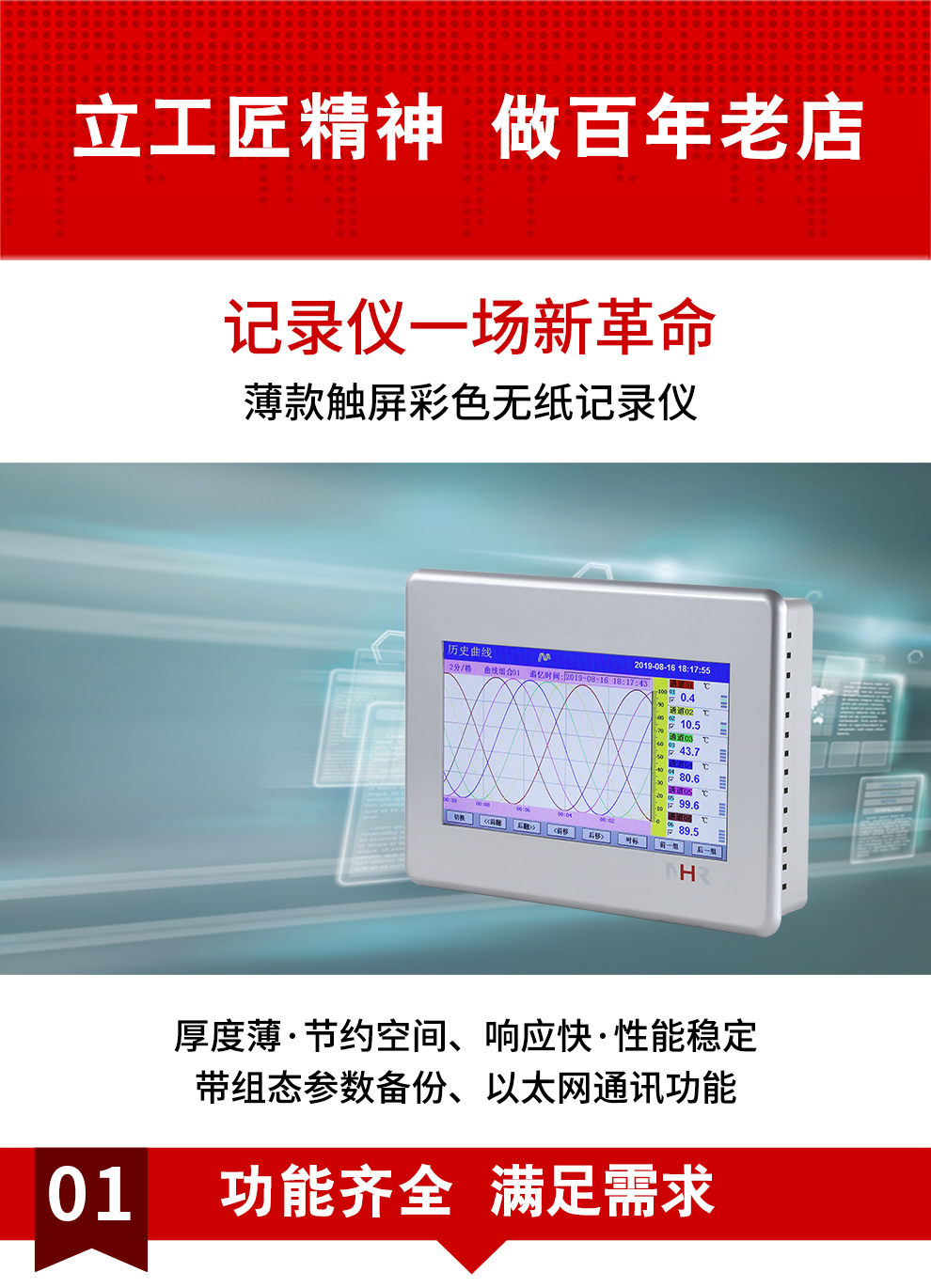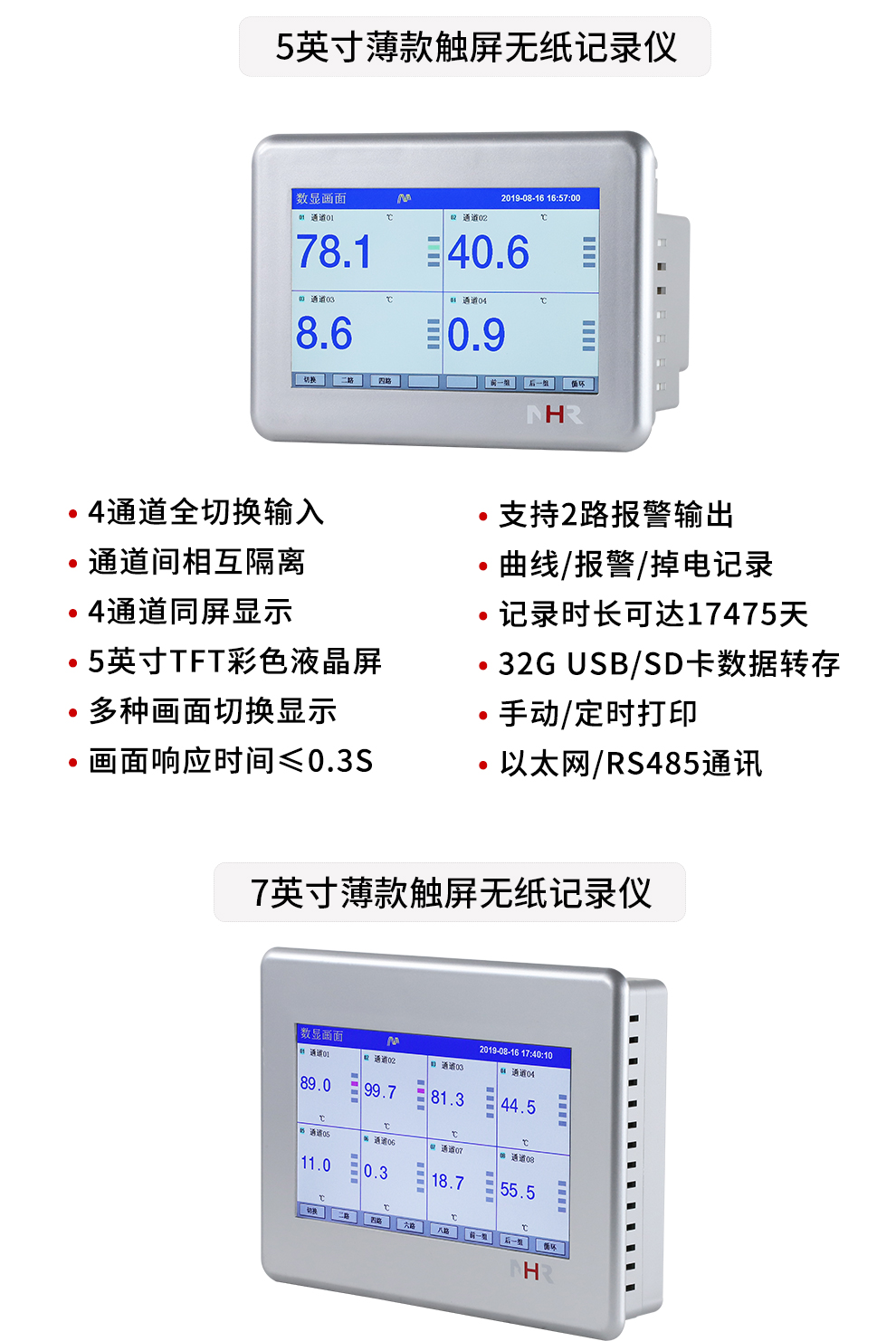NHR-T系列觸摸超薄無紙記錄儀采用新型大規(guī)模集成電路,對輸入、輸出、電源、信號采取可靠保護和強抗干擾設(shè)計。8路萬能信號輸入(可組態(tài)選擇輸入:標準電壓、標準電流、熱電偶、熱電阻、頻率、毫伏等)。可帶4路報警輸出,1個饋電輸出,RS485通訊接口,以太網(wǎng)接口,微型打印機接口和USB接口,SD卡插座。
