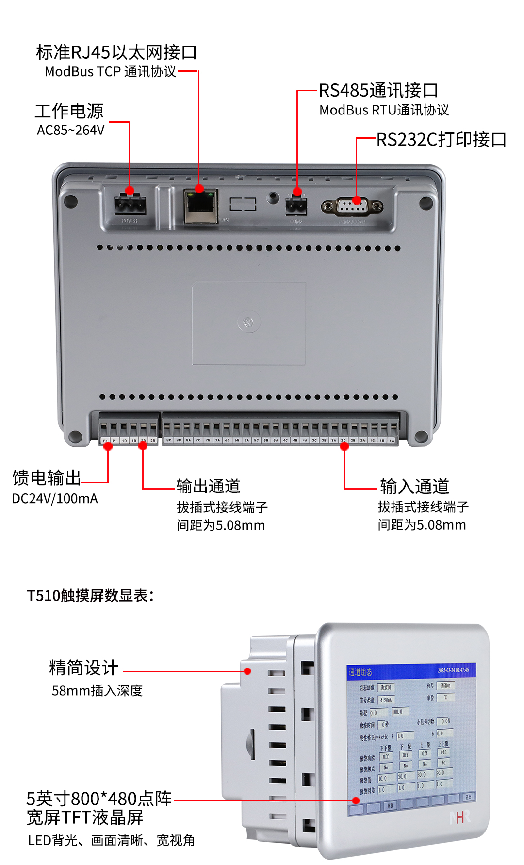 NHR系列觸摸屏數(shù)顯表采用新型大規(guī)模集成電路,對輸入、輸出、電源、信號采取可靠保護和強抗干擾設計。4路萬能信號輸入(可組態(tài)選擇輸入:標準電壓、標準電流、熱電偶、熱電阻、毫伏等)??蓭?路報警輸出,1個饋電輸出,RS485通訊接口,以太網(wǎng)接口,微型打印機接口;具有強大的顯示功能,實時測量顯示,棒圖顯示,報警狀態(tài)顯示,組態(tài)畫面顯示等。