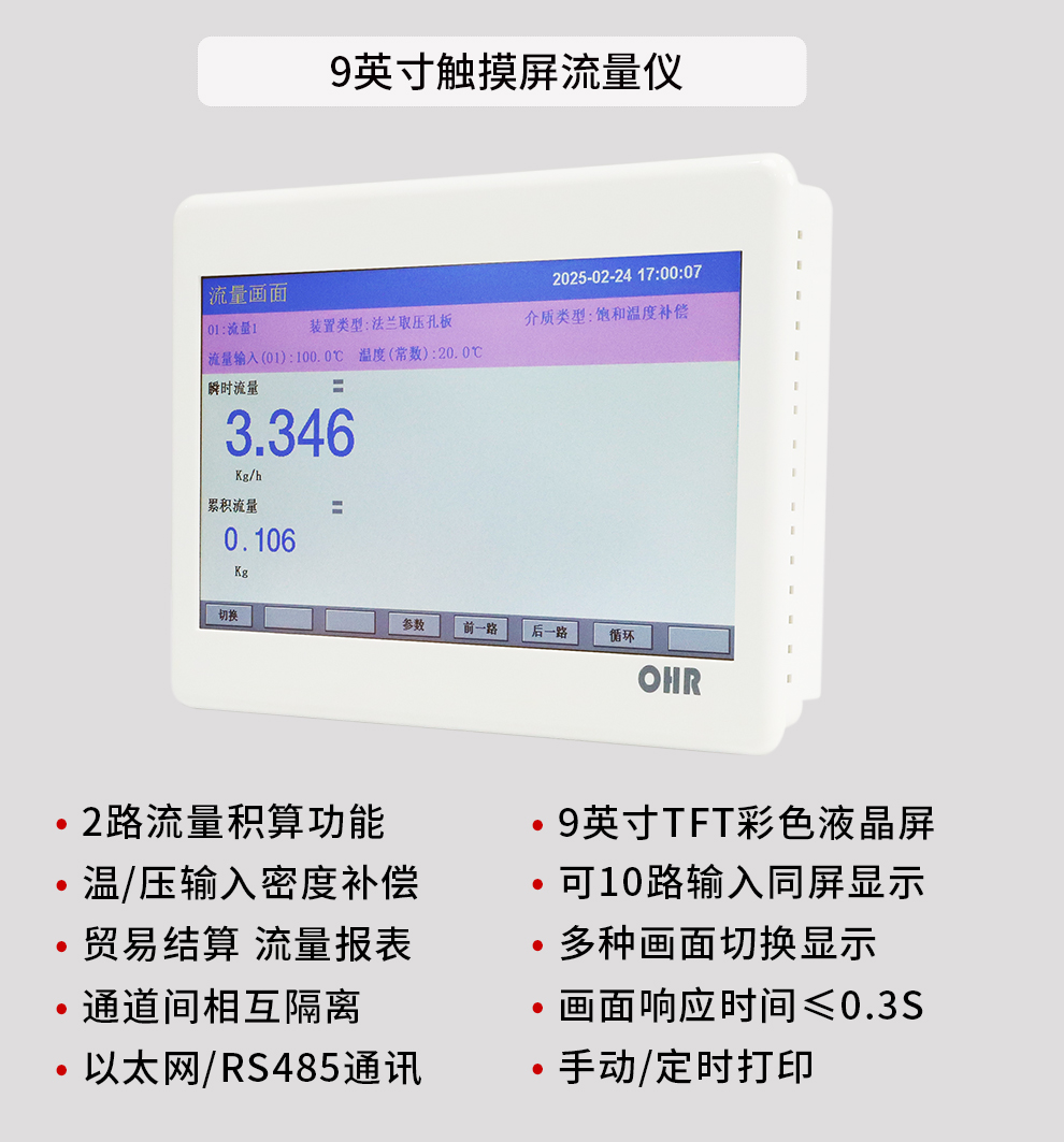 NHR系列系列觸摸屏流量?jī)x最多6路萬(wàn)能輸入其中可帶2路流量輸入。具有繼電器報(bào)警輸出、變送 輸出,饋電輸出,流量積算,溫壓補(bǔ)償功能;可帶RS485通訊接口,以太網(wǎng)接口,微型打印機(jī)接口;具有強(qiáng)大的顯示功能,實(shí)時(shí)測(cè)量顯示,棒圖顯示,報(bào)警狀態(tài)顯示,流量顯