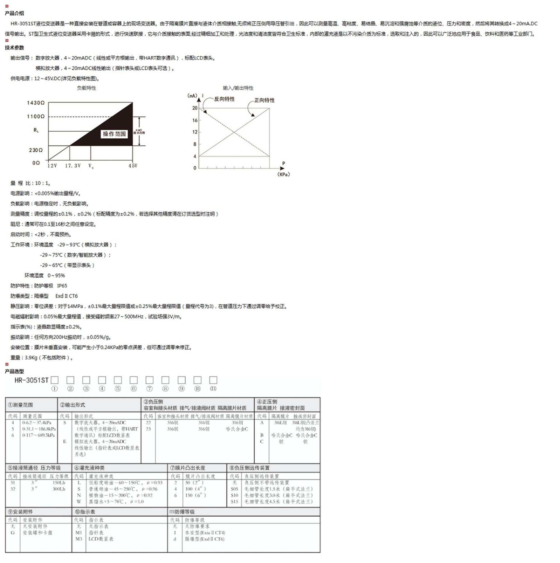 HR-3051ST液位變送器是一種直接安裝在管道或容器上的現(xiàn)場變送器。由于隔離膜片直接與液體介質相接觸,無須將正壓側用導壓管引出,因此可以測量高溫、高粘度、易結晶、易沉淀和強腐蝕等介質的液位、壓力和密度,然后將其轉換成4~20mA.DC信號輸出。