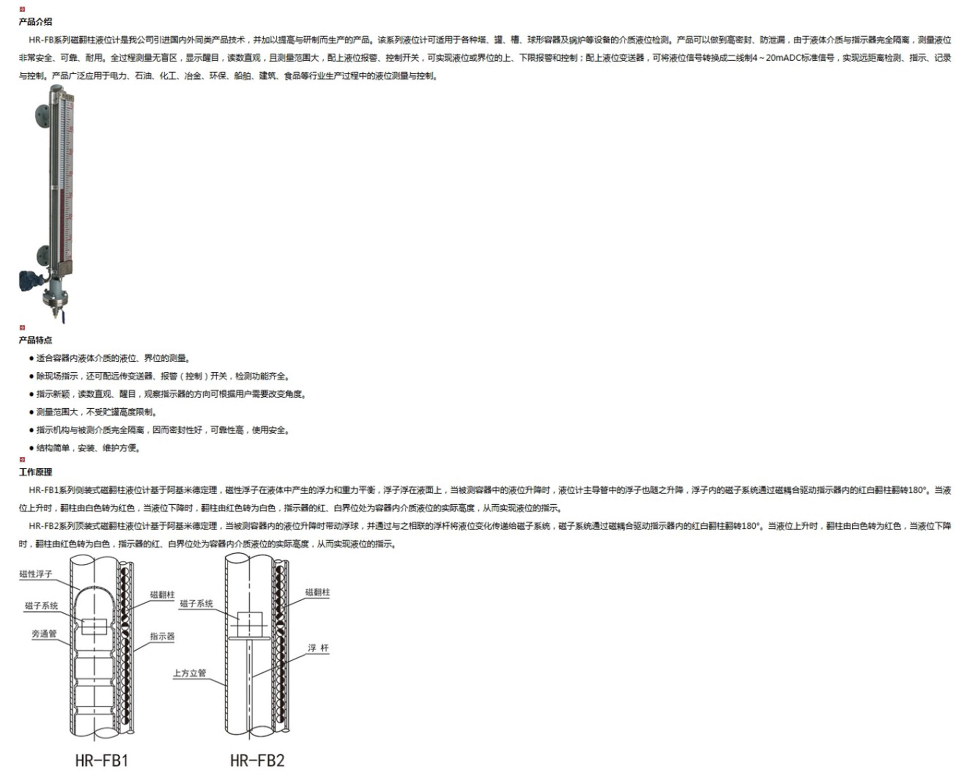 HR-FB系列磁翻柱液位計是我公司引進國內(nèi)外同類產(chǎn)品技術(shù),并加以提高與研制而生產(chǎn)的產(chǎn)品。該系列液位計可適用于各種塔、罐、槽、球形容器及鍋爐等設(shè)備的介質(zhì)液位檢測。產(chǎn)品可以做到高密封、防泄漏,由于液體介質(zhì)與指示器完全隔離,測量液位非常安全、可靠、耐用。