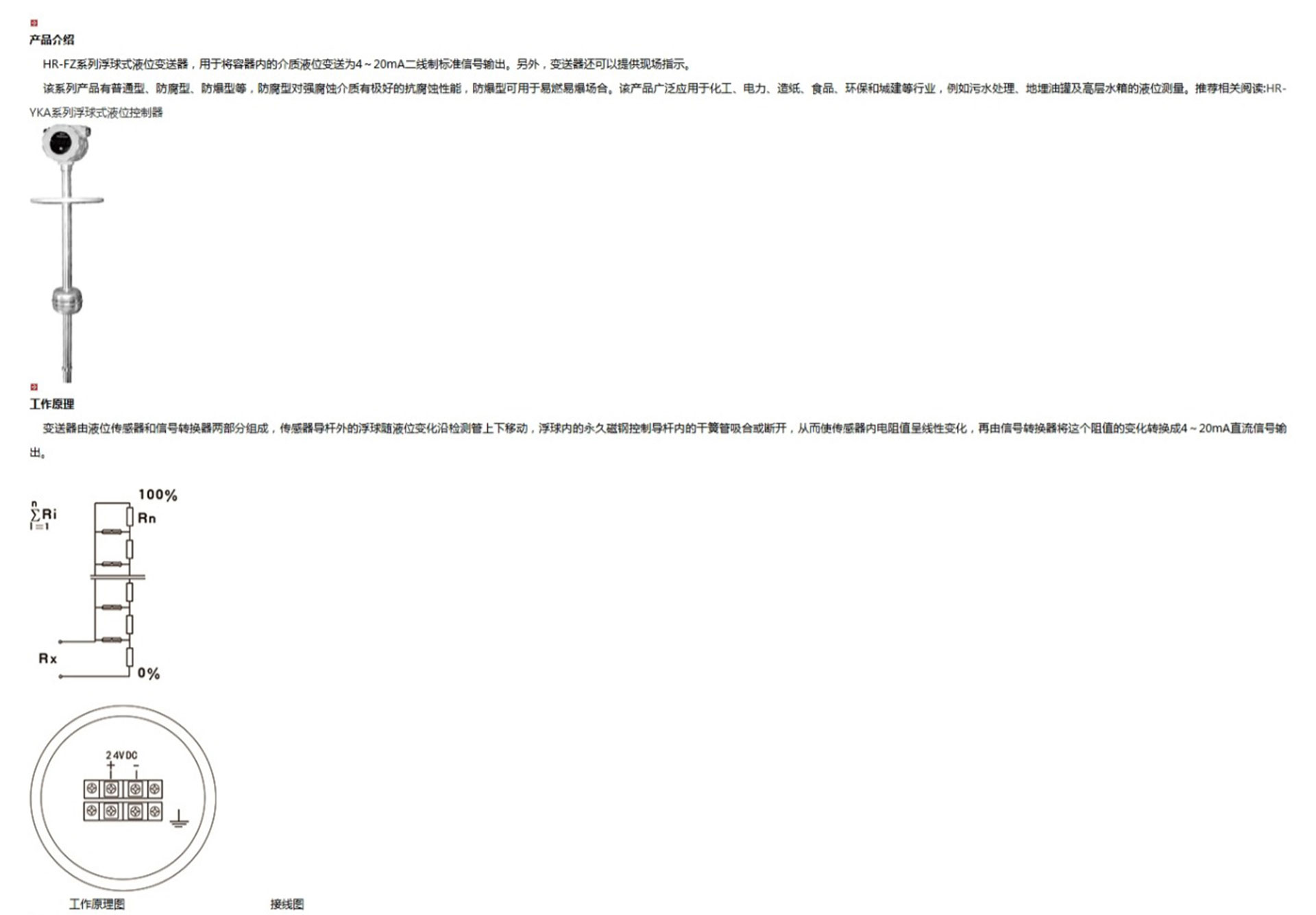 HR-FZ系列浮球式液位變送器,用于將容器內(nèi)的介質(zhì)液位變送為4~20mA二線制標(biāo)準(zhǔn)信號輸出。另外,變送器還可以提供現(xiàn)場指示。